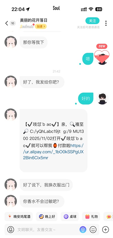 闲来没事,玩S开头的软件,不是有个每天匹配30次的功能吗,匹配到了一个刚注册的女的,我起初还没在意就打了招呼,她说她是89年的,聊了下换了照片,不知咋的就开始往那方面聊了,后面提出要见面试试,我开始也没多想,因为看着确实是普通人的样子,然后就是找酒店发代付,我也是头回遇到,就付了,越想越不对劲,抖音上查了下早就有这种套路了后面就不多说了,城里套路深啊,还好就100来块钱,也当是买个教训了,提醒下各位老哥,这种代付是退不了款的,这是人家自己做的链接,只要有发这个的都一样,一律是骗子!