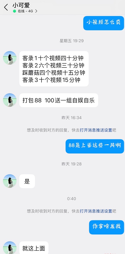 qq空间最近一直在卖小视频,说又是自娱自乐的又是采蘑菇的。由于之前找过此人,当时感觉服务态度、性格啥的都还不错,条也不错。于是想一饱眼福。结果付款完毕后,发来的东西第一感觉就不是本人,三十多条视频没有一条能对应证明是本人的,不是没露脸就是一闪而过。但只要细心对比,就能发现,视频中女主、穿衣风格、美甲、发色、身材、肤色、甚至娇喘声差异明显。最重要的一点是,其中一条视频中竟出现了女主和男主的对话(该知道的人都知道,此人是聋哑人),于是我便问她,她说是她妹妹在说话。于是我又问,为什么会是你妹妹,她说她俩的视频在一起,都是妹妹整理,里面难免有她的。于是我又问,为什么你卖之前不说有你的和你妹妹的,她没做回复。此人主观骗意非常强,本人反诈意识不足,发此文望大家斟酌。