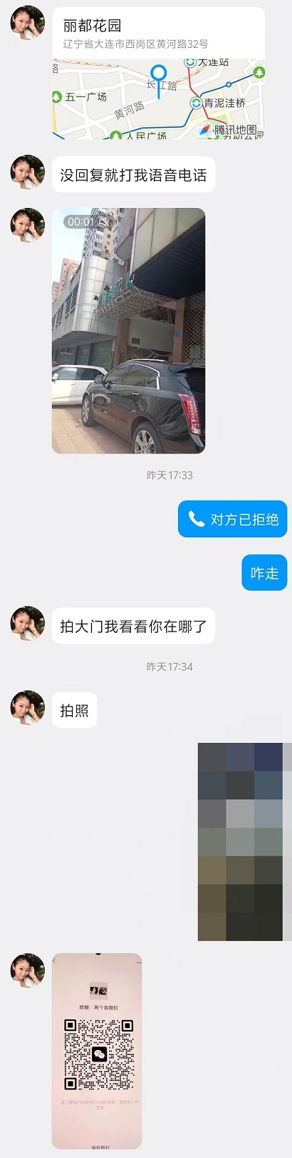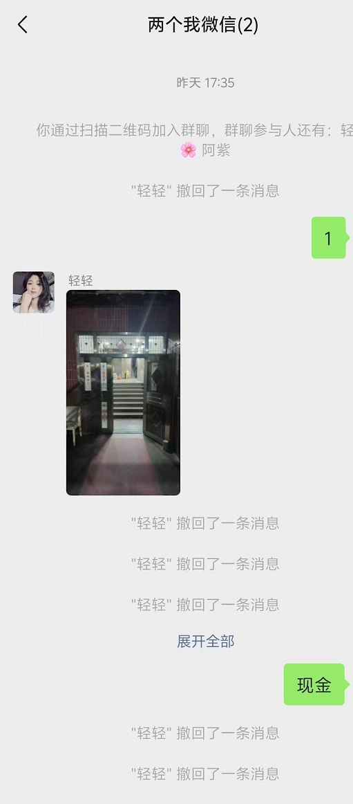 空间有大量个人照片,感觉应该是盗图或者是盗视频,聊天介绍联系地址为丽都花园,到达地址后要求你拍照片,我以为是代聊,需要确定顾客到场好收钱,拍完照片发二维码拉群,进群后先表示要下楼接,让我先等一下,然后就发支付宝收款码,说什么最近管控严格、别的顾客都是这样操作的、骗人司马之类的孤儿发言,我一看这个态势,人都没看见就要钱,九成是骗子,遂表示给现金,对方随即撤回了所有消息,并将我移出群聊,后来我一扫这个支付宝码,一看就是个男的,叫xx利。